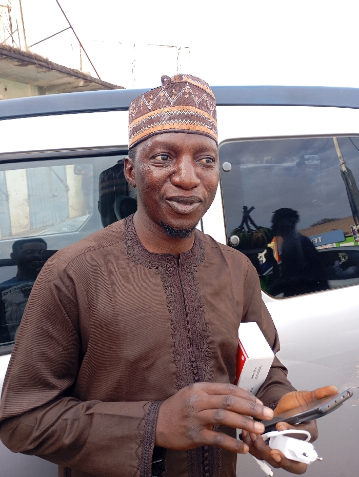 A smiling man with a patterned hat and brown attire stands outside near a silver car. He holds a smartphone, a charger, and a small white box, possibly containing a new phone. Reflections of people and objects are visible in the car's windows. The background features a building and a glimpse of the street. The lighting suggests daytime.