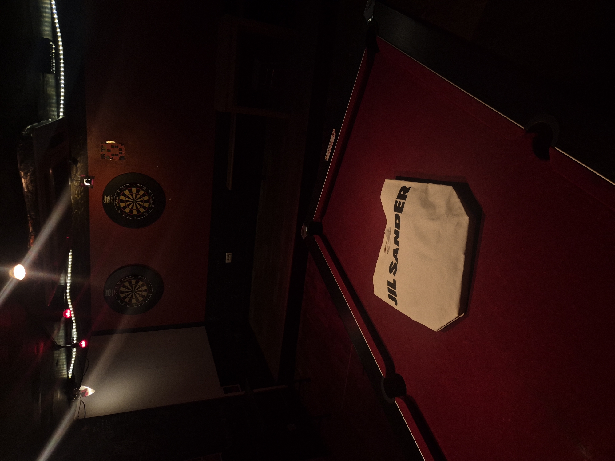 This image depicts an interior view of a dimly lit recreational space within an entertainment establishment in the city of Unknown, Unknown. In the foreground, a standard-sized pool table with a dark red felt surface and dark wooden rails occupies the central lower portion of the frame. Centered on the pool table felt is a light beige or off-white shopping bag, displaying the capitalized text "JIL SANDER" in black lettering. The bag appears to be made of paper or a similar material, exhibits minor creasing, and has dark handles. The background features a dark reddish-brown paneled wall. Mounted prominently on this wall are two "Target" brand dartboards, each with a black surround and traditional scoring segments. A small, multi-colored object is affixed to the wall between the two dartboards. Below the dartboards, a raised, dark wooden platform extends horizontally across the wall. To the left, a section of a light-colored wall is visible, illuminated by a focused beam of light originating from an overhead fixture. The ceiling is dark, with multiple artificial light sources contributing to the dim illumination. These include several exposed, warm-toned ceiling bulbs, a strip of white LED lights running along a ceiling edge, and at least two distinct red light fixtures. No individuals are present or visible in the scene, and no actions or interactions are depicted.