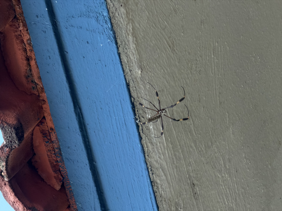 A spider, identified as a golden silk orb-weaver, clings to a gray wall near a blue painted surface. The spider is large, with long legs marked with yellow bands. The wall has a textured surface, while the blue area appears to be painted wood with ridges. To the left, part of a red, possibly clay tile roof is visible.