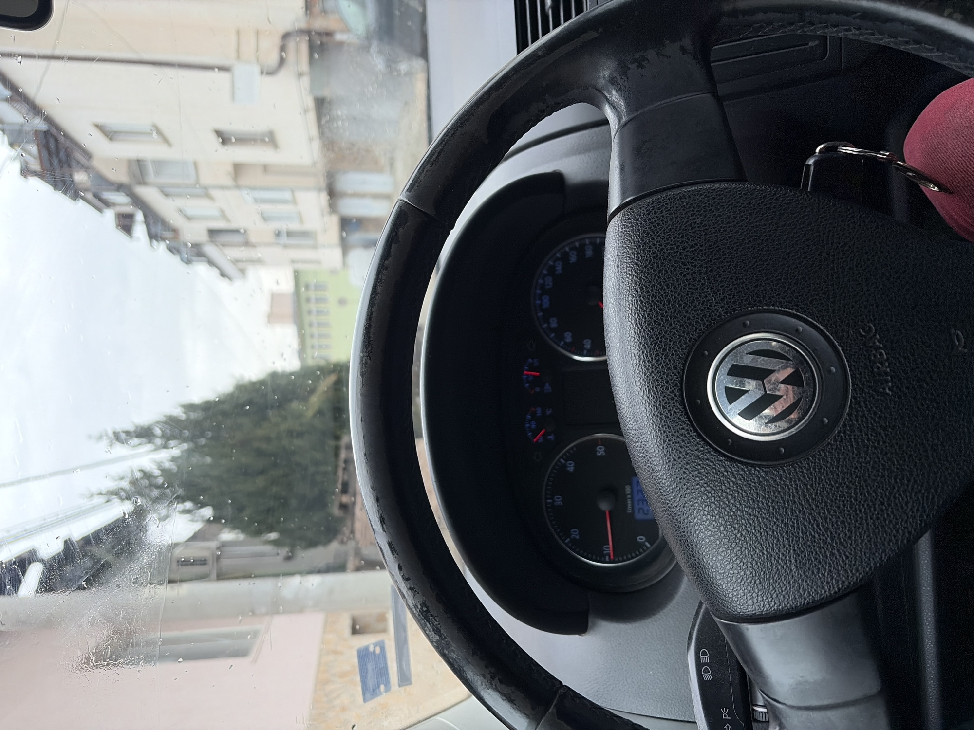 interior of a car, specifically the steering wheel of a Volkswagen, with the dashboard partially visible. The car's dashboard indicators show the engine RPM. Outside the car window, buildings and greenery can be seen. It appears to be a cloudy day with raindrops on the car window. Based on the surroundings, the location is identified as the city of Peshtera, Bulgaria.
