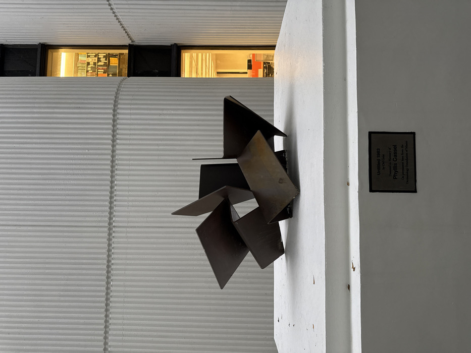 A metal sculpture is mounted on a white, angular wall. The sculpture features overlapping, dark-toned geometric shapes. To the right, a plaque reads "Untitled 1983, by Cliff Cain, Donated in Memory of Phyllis Cassel." To the left, a horizontally ridged wall is visible, with windows above showing a glimpse of a room interior. The overall image composition is taken at an angle.