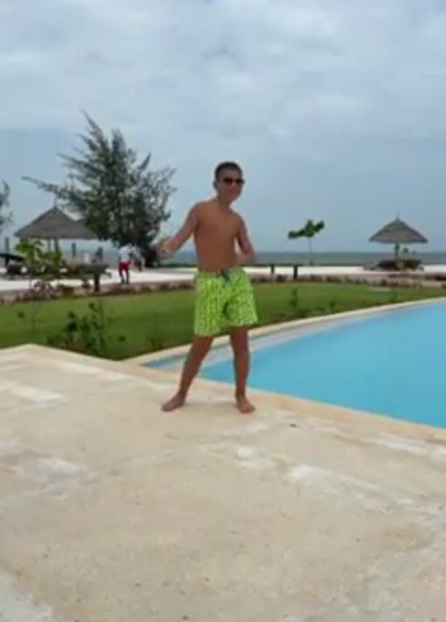 A young boy wearing sunglasses and neon green patterned swim trunks is standing barefoot on a concrete platform next to a turquoise swimming pool. He is striking a pose with his arms outstretched and angled downwards. Behind him is a grassy area with trees and two thatched-roof structures that appear to be beach umbrellas. In the background, there is a beach and the ocean under a cloudy sky. A person in red clothing is walking in the background near one of the thatched-roof structures.