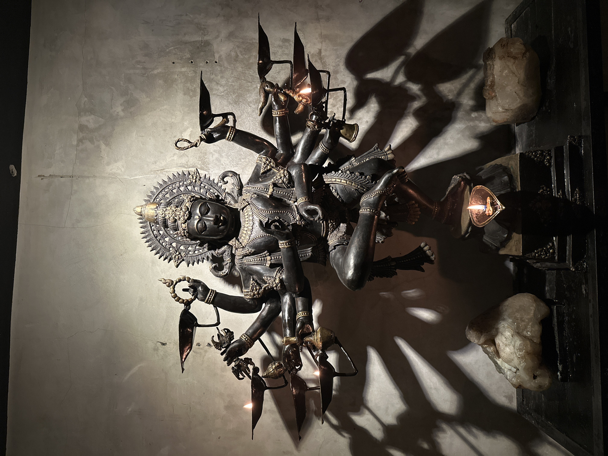 A dimly lit, indoor scene features a multi-armed, black metal deity statue mounted on a gray plaster wall. The statue is adorned with intricate details and appears to be holding various objects. Candles affixed to the statue’s arms cast long shadows on the wall. To the right, partially obscured, are white rocks mounted on a black wooden frame. The location is Pererenan, Indonesia.