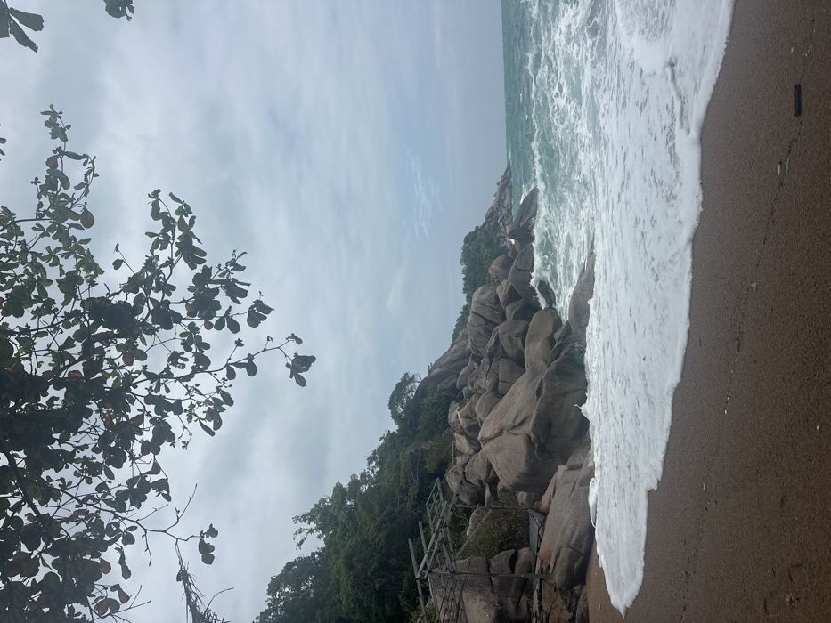 A coastal scene shows a rocky cliff meeting the ocean. Large granite boulders form the cliff, partly covered in green trees. Waves crash against the rocks and beach, creating white foam. Dark sand is visible on the shoreline. A leafy tree branch frames the left side of the scene. The sky is overcast with grey clouds.