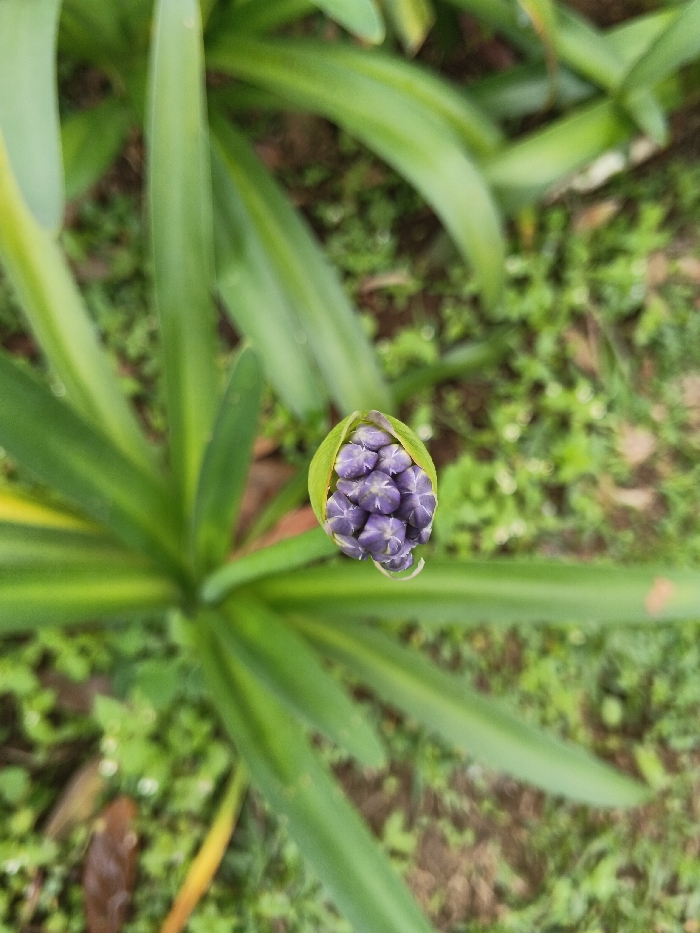 A close-up aerial view showcases a vibrant purple flower bud encased in a green sheath. The bud is positioned in the center, surrounded by long, radiating green leaves, partially blurred, creating a starburst effect. The background consists of a verdant ground cover, adding depth and texture to the composition. The overall image captures the anticipation of a bloom, emphasizing the plant's delicate beauty.