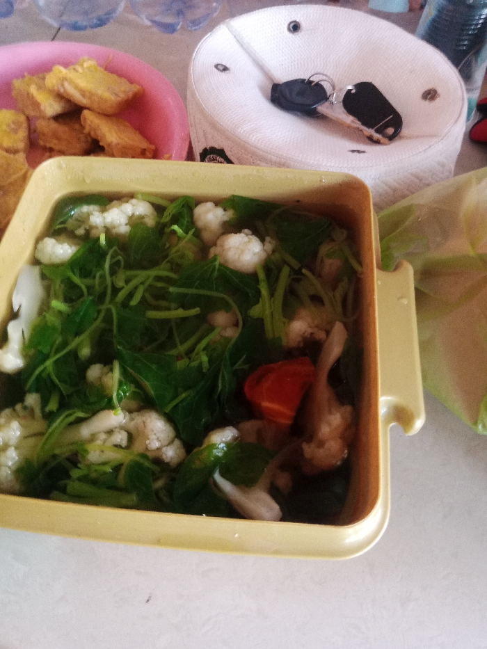 A yellow container holds a mixture of green leafy vegetables, cauliflower florets, and a single red tomato slice submerged in a liquid. Next to it, a pink plate holds fried tofu pieces. A white prayer cap with keys on top is also present. Bottles of water are visible in the background. A plastic bag is adjacent to the container. The composition suggests a meal arrangement.