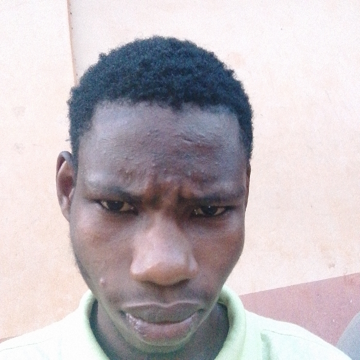 A close-up portrait captured in the city of Nsugpe, Nigeria, depicts a dark-skinned male individual, appearing to be a young adult. He has short, dark, curly hair. His facial expression is characterized by narrowed eyes, slightly furrowed eyebrows, and a downturned mouth. A horizontal scar or indentation is visible on his forehead, along with minor blemishes. He is wearing a light-colored, collared shirt. The background consists of a plain, unadorned wall, uniformly light beige or peach in color. No other individuals or significant objects are present within the frame.