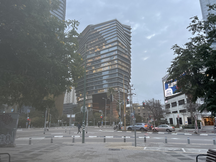A cityscape on an overcast day features a prominent, modern high-rise building with illuminated windows