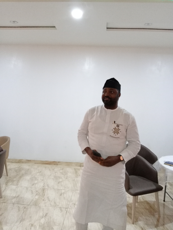 man in a white long-sleeved shirt and black cap standing in a room. He is holding a black cell phone in his right hand, and his left hand is resting on his right wrist. There are two chairs and a table with an object on it to his right. The room has white walls, tiled floors, and a white ceiling with recessed lighting. The man is looking towards the left of the frame. The image is taken from a perspective that appears to be slightly below the man's eye level. The man is the only person in the image. The location is an interior space in Yola, Nigeria (coordinates: 9.198, 12.492). It is most likely an office or waiting area. The setting is neutral, and there are no other objects that indicate the time of day or the purpose of the room.