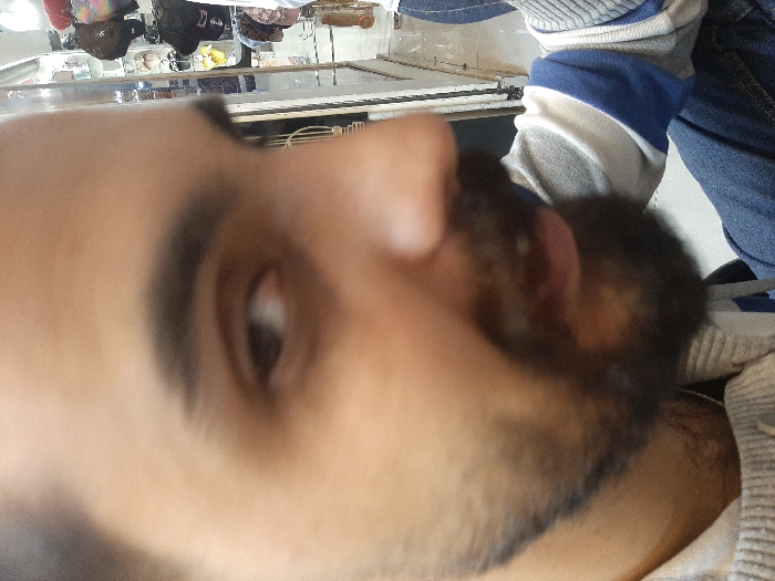 A close-up portrait features a man with dark hair and a beard, gazing off to the side. His skin tone is olive, and his expression is neutral. He's wearing a casual outfit with a striped sleeve visible. The background appears to be a shop with various items displayed on shelves and racks. The lighting is somewhat soft, casting shadows on his face. The image is slightly blurry.