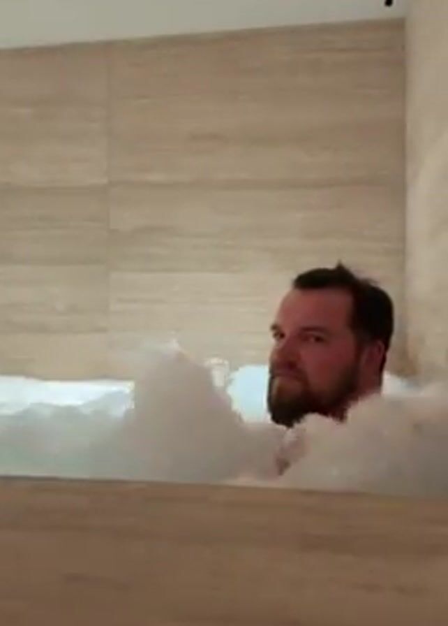 A bearded man is sitting in a bubble bath. The bathroom walls are covered in a light colored stone pattern. An overhead light fixture illuminates the room. The man looks directly at the camera. He appears relaxed. The bath is filled with dense, white bubbles.