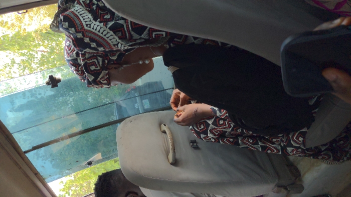 The image presents the interior of a vehicle, likely a commercial bus, viewed from a passenger's perspective. In the immediate foreground, a dark-skinned hand holds a black smartphone, positioned at the bottom right. The primary subject is a female passenger seated to the right, observed from the upper torso. She wears a black top and a headwrap adorned with a black, white, and red geometric pattern. Her hands are engaged in front of her, appearing to manipulate a small item or her fingers, with faint scars visible on her left forearm. She wears long, double-pearl drop earrings. Ahead and to the left of her, the back of a male passenger's head and a portion of his shoulder are visible, showing short, dark curly hair. He is seated in a light-beige fabric seat, which features a grab handle on its back. Through the vehicle's tinted side window, an outdoor scene unfolds, revealing dense green foliage (trees), a road, and the rear section of a dark-colored vehicle, possibly a Toyota, displaying a partially visible Nigerian license plate with white characters on a green background. This plate type is consistent with vehicles registered in the Federal Capital Territory. While the specific street is not discernible, the context indicates a location within Abuja, Nigeria.