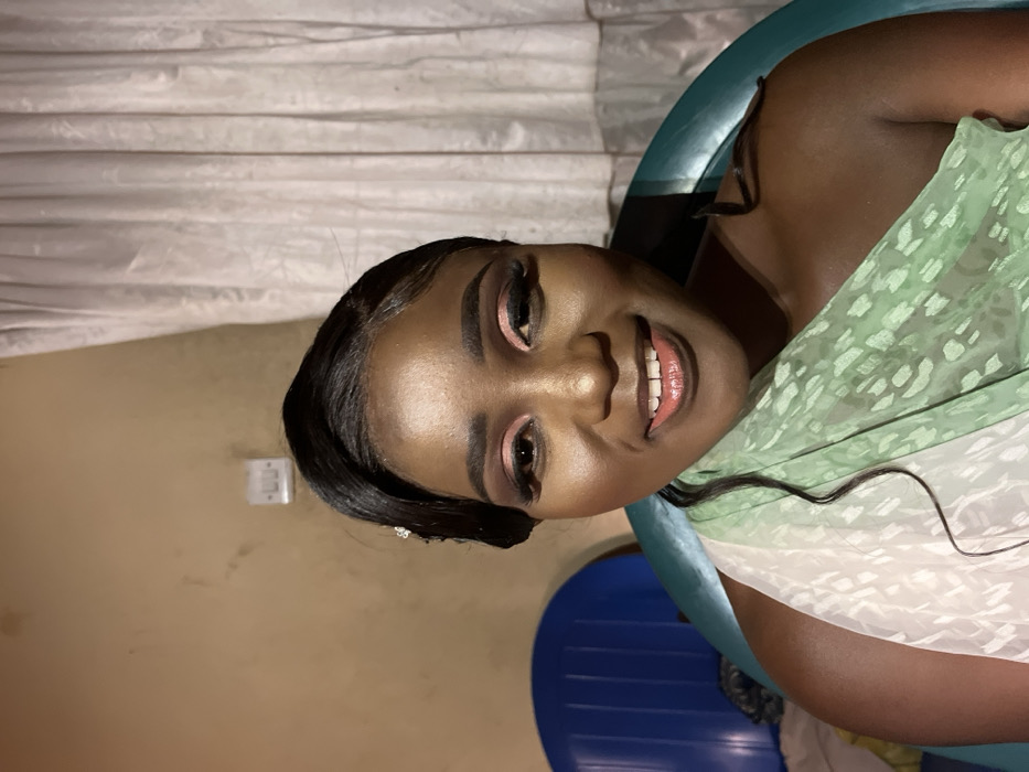 A young adult female with dark skin is depicted from the chest up, seated indoors in what appears to be a residential setting within Kuru Dungus, Nigeria. She has dark hair styled with a deep side part, adorned with a small silver accessory on the left side, and a loose dark curl draped over her left shoulder. Her face is made up with pink eyeshadow, winged eyeliner, lipstick, and foundation, and she exhibits a broad smile, revealing her upper teeth. She is wearing a one-shoulder garment, possibly a dress or wrap, composed of two distinct fabric sections: a sheer white or light cream material on her left and a sheer light green material with an irregular light-colored dot pattern on her right. Behind her left shoulder, part of a blue plastic chair is visible. Behind her right shoulder, a dark teal or green plastic chair is partially visible. The background consists of a plain light brown wall with some discoloration, featuring a white double wall switch mounted above her head to the left. To the right of the frame, white, textured curtains are visible.
