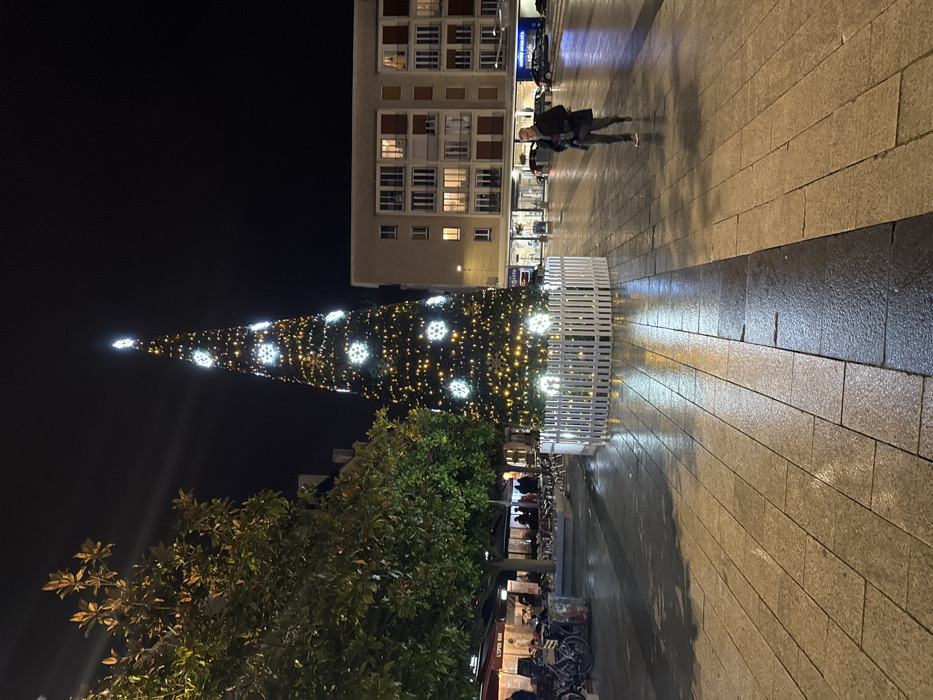 A nighttime cityscape features a large, illuminated Christmas tree adorned with snowflakes and string lights. It stands prominently on a paved plaza next to a leafy tree, close to a building, and adjacent to a bar or restaurant. A person is walking across the street, with cars and lights blurring slightly in the background. The reflective pavement adds to the city's ambiance.