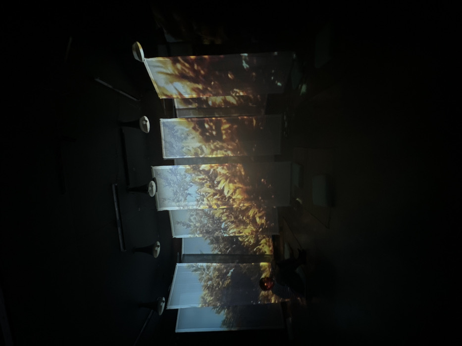 A dimly lit room features hanging rectangular screens displaying a nature scene with trees. Light shines onto the screens, creating a layered visual effect. Each screen is suspended from a metal rod with a trumpet-shaped light fixture attached above. A person is faintly visible in the bottom right corner, adding a sense of scale. The overall atmosphere is dark and mysterious, highlighting the illuminated screens.
