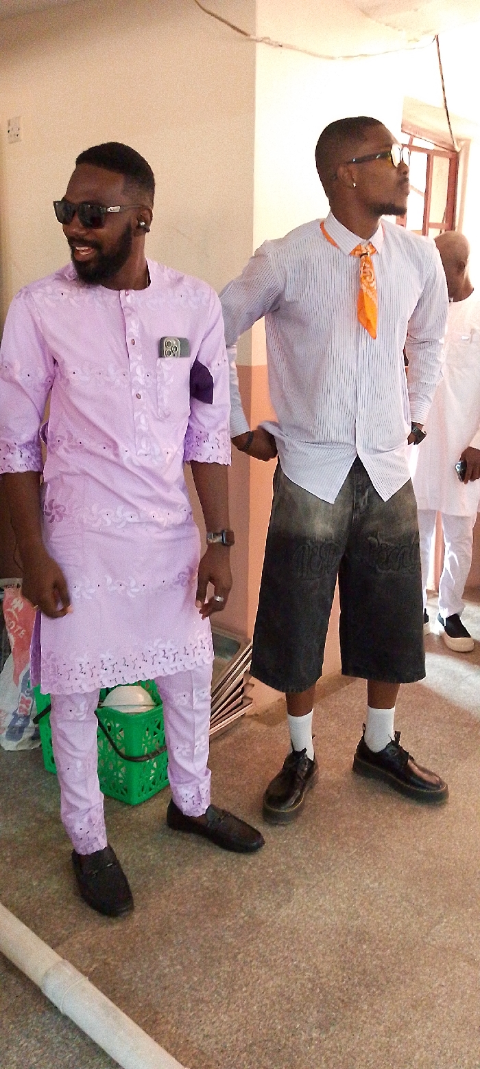 The scene depicts an indoor setting in Kubwa, Nigeria, featuring three males standing on a light brown textured floor against light-colored walls. In the foreground on the left, a male with dark skin, a short dark beard, and a faded haircut stands facing forward, smiling slightly. He wears dark sunglasses and a light purple traditional Nigerian ensemble, consisting of an embroidered long tunic with a mandarin collar and matching trousers. A silver-colored smartphone is clipped to his left chest pocket, partially obscured by a dark purple fabric accent. He wears a watch on his left wrist and a ring on his right ring finger. His footwear consists of dark slip-on shoes. Behind him, two green plastic woven baskets are visible, along with a stack of metallic rectangular trays. To the right of the first individual, a second male with dark skin, a short haircut, and stubble stands, looking towards the right. He wears dark sunglasses and a small hoop earring in his left ear. His attire includes a white pinstriped long-sleeved shirt with an orange patterned neckerchief, dark acid-washed denim shorts that reach below the knee, white socks, and black chunky-soled lace-up shoes. A watch is visible on his left wrist and a ring on his right ring finger. His left hand is positioned near his waistband. Partially visible in the background on the far right is a third male with dark skin and a bald head, wearing a white long-sleeved garment and dark shoes. A brown window frame is discernible in the upper right background, indicating an external light source. An electrical outlet is present on the wall behind the first man. In the immediate foreground, a white cylindrical object rests horizontally on the floor.
