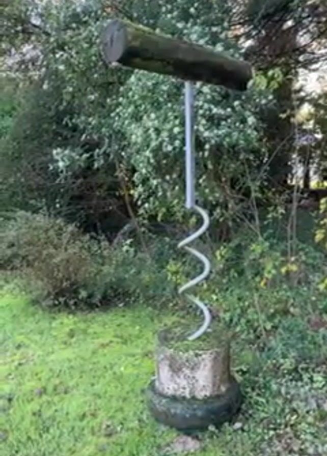 whimsical garden sculpture. It resembles a corkscrew, with a moss-covered cylindrical base supporting a metal spiral form. Above the spiral is a straight metal rod supporting a weathered log, oriented horizontally. The sculpture is set in a grassy area with lush greenery including trees and bushes, creating a natural backdrop.