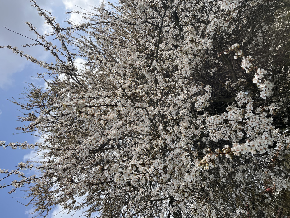 The image displays a deciduous tree in full bloom, situated in Pchelnik, Bulgaria. The tree is densely covered with numerous small white flowers, clustered along its dark, otherwise bare branches. Patches of bright blue sky with scattered white clouds are visible through the upper portions of the tree canopy. No individuals, animals, or man-made structures are present within the frame. The scene suggests early springtime.