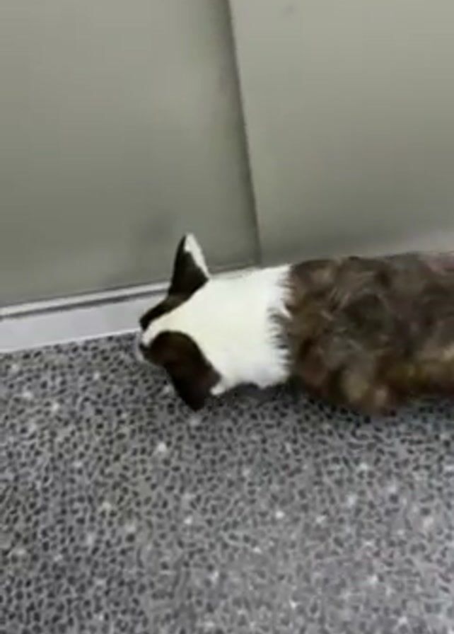 brindle and white corgi dog sniffing along the baseboard of a gray wall on a floor covered in small, gray, pebble-like stones. The camera follows the dog's movements. The dog is focused on the wall, sniffing intensely. The dog stops sniffing and looks up at the camera at the end of the clip. A person's feet are visible at the bottom of the frame.