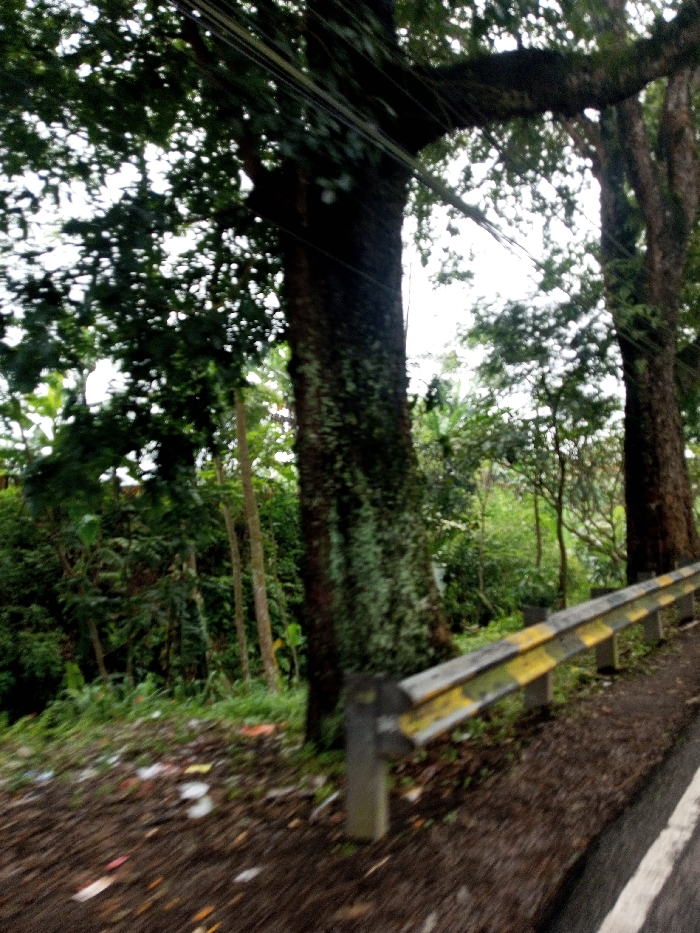 The image depicts a roadside scene in Sandamal Eliya, Sri Lanka. The foreground features a dark dirt shoulder on the left, littered with various items including plastic and paper debris. To the right, a section of an asphalt road with a faded white edge line is visible. A metal guardrail, painted with alternating yellow and black stripes, runs horizontally across the midground, partially obscuring the lower portions of large trees behind it. The guardrail is supported by grey posts. Beyond the guardrail, dense, vibrant green foliage and multiple large trees dominate the background. These trees possess thick, dark, textured trunks, some appearing to be covered in moss or lichen, and their dense canopies extend upwards, largely obscuring the overcast sky. Multiple dark utility lines are visible strung across the upper-left portion of the frame, passing through the tree branches. No people or animals are present in the scene.