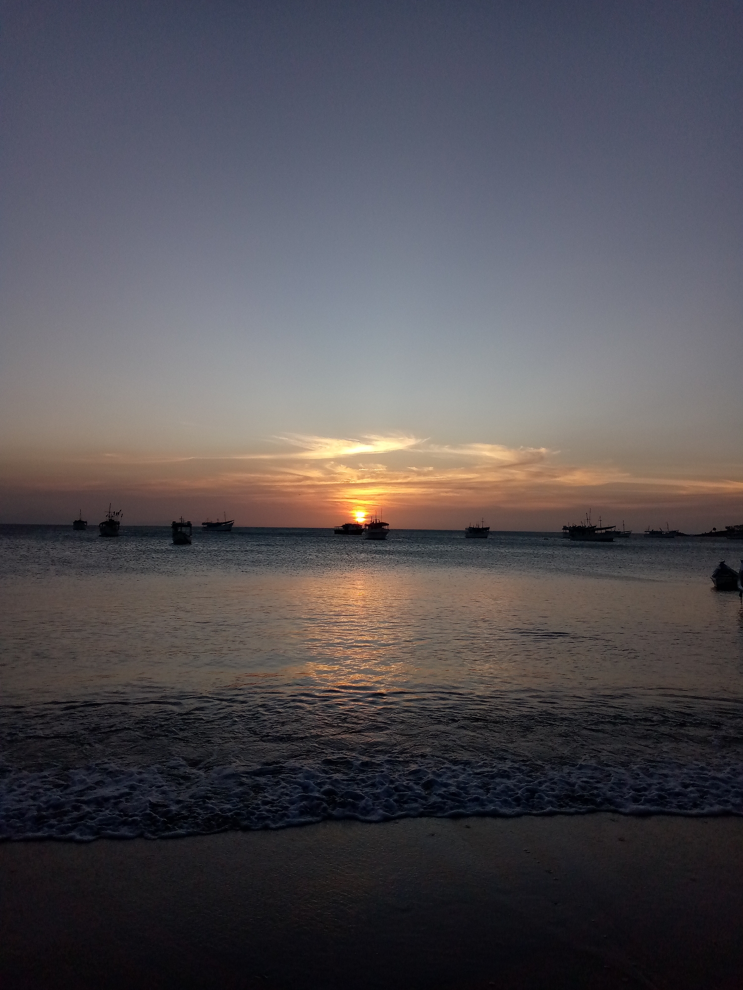 sunset over the ocean with several boats silhouetted on the horizon