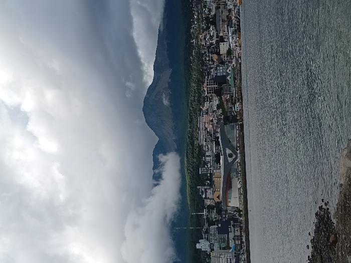 A serene waterscape meets a cloudy mountain vista. Alongside the water's edge, a town nestles with dense buildings and a forest. A road intersects the town. The sky is heavy with dark clouds, shrouding the mountain peaks and partially obscuring the landscape.