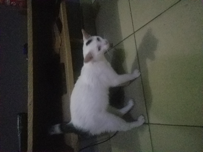 - "A white cat with black markings on its head and a striped tail is seated on a tiled floor" by FM-ycer72, licensed under CC BY 4.0