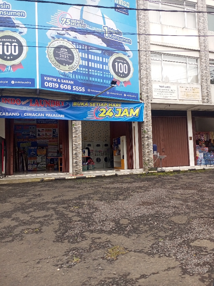 commercial building with an Indo Laundry storefront. A large sign advertises the laundry service with the slogan "75 Menit Selesai Laundry" and a phone number for feedback. Below, a blue banner proclaims "Indo Laundry Buka Setiap Hari 24 Jam" along with the branch location. Next door is a Notaris office. The facade of the building is a mix of stone and stucco. A street is visible in front of the building.