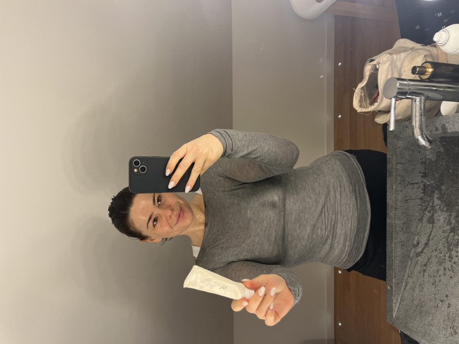 The image depicts a female subject captured in a mirror selfie within a bathroom setting in Carency, France. The subject, an adult female with dark hair pulled back, exhibits visible perspiration on her forehead and neck. She wears a grey, long-sleeved, boat-neck top and dark bottoms. Her fingernails are manicured with white polish. In her right hand (viewer's left), she holds a partially squeezed, light-colored tube, possibly containing a cosmetic or skincare product, with faint text visible. In her left hand (viewer's right), she holds a dark-cased smartphone, identified by its triple camera array, positioned to capture the reflection. Her expression is a slight smile. The foreground of the reflection shows a dark grey, textured stone sink basin, stained with water marks, beneath a modern chrome single-lever faucet. To the right of the faucet, various toiletries are present, including a black pump bottle, a white aerosol can, and a light-colored canvas bag containing additional items, such as makeup brushes. The reflected background reveals a room with a light-toned wooden floor and a white wall that angles upwards, indicating a sloped ceiling or attic space. Several small, bright light sources are visible as reflections on the floor and the mirror surface, which also shows minor smudges.