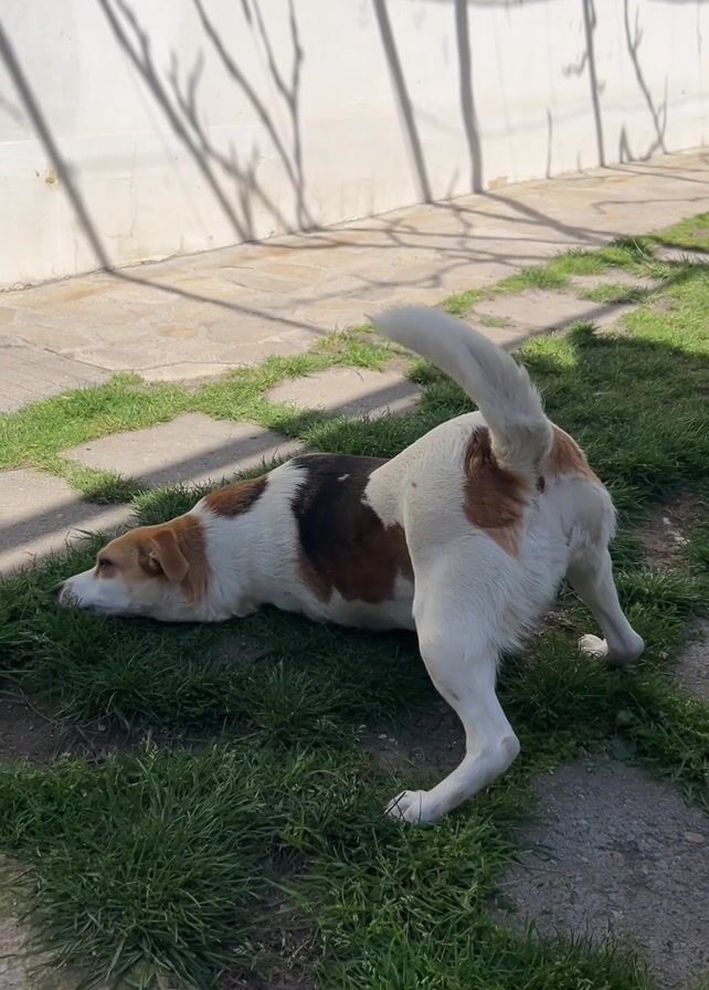 A medium shot captures a medium-sized dog rolling on a patch of grass adjacent to a cement walkway. The dog has predominantly white fur with brown and black patches. Its head is down on the ground and it is attempting to roll over on the grass. The tail is erect, but the dog is having some difficulty getting up. In the background, a white wall with some shadows is visible. The light is bright and it appears to be daytime. The scene is static with no camera movement.