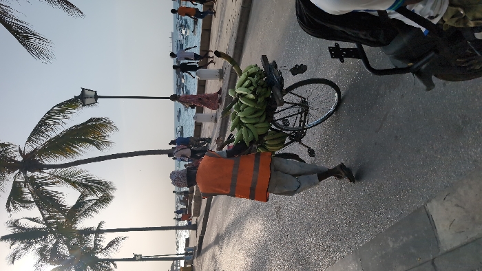The image captures a daylight scene along a paved coastal road or promenade, identified as likely Stone Town, Zanzibar City, Zanzibar, Tanzania. A person, viewed from behind, is the primary subject in the mid-ground, walking leftward on the asphalt road. This individual wears an orange high-visibility vest with horizontal reflective stripes over a light-colored shirt, light-colored pants, and a patterned cap. They are barefoot. The person is pushing a dark-colored utility bicycle heavily laden with numerous bunches of green bananas on a large rear rack. In the immediate foreground, to the lower right, parts of another vehicle, including handlebars and a black seat or storage compartment, are partially visible. The background features a bustling waterfront with multiple individuals walking or standing along a lighter-colored paved promenade. Beyond the promenade, the calm, light blue ocean is populated with numerous small to medium-sized boats. A larger vessel is discernible on the distant horizon. Tall palm trees with green fronds are silhouetted against a bright, clear, light blue sky, which indicates fair weather. Two ornate dark-colored street lamps are visible, one prominently positioned to the right of the central figure. White concrete bollards line the edge of the promenade, separating it from the water.
