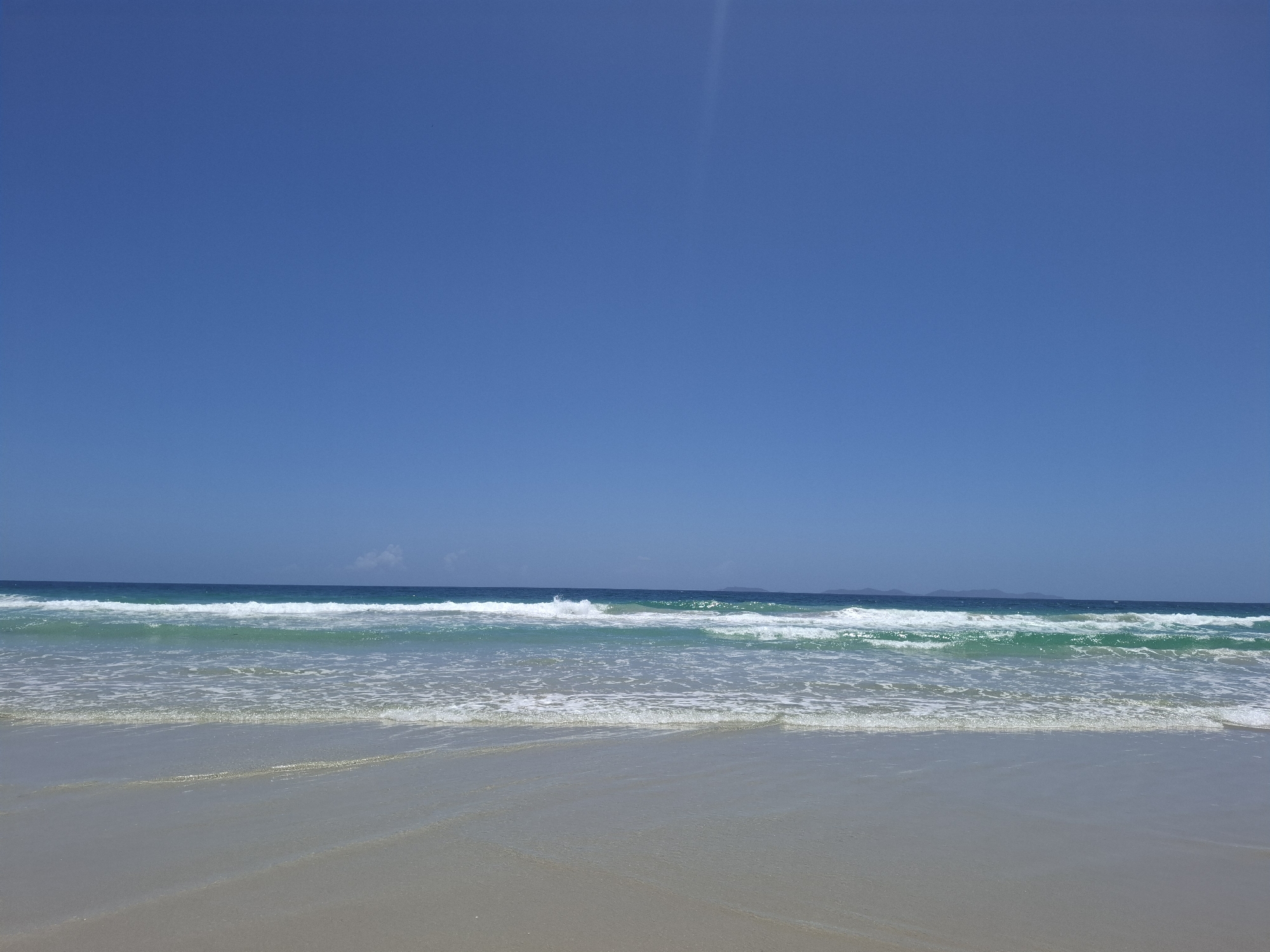 The image depicts a coastal scene at Playa El Agua, Venezuela, characterized by a serene atmosphere under a clear, bright blue sky. The beach consists of a sandy shore gently sloping towards the ocean. Shallow waves roll towards the beach, creating foamy white water that contrasts with the turquoise hues of the sea. In the distance, a faint outline of land is visible on the horizon. No people are present in the view. The environment is pristine, suggesting a tranquil day at the beach.