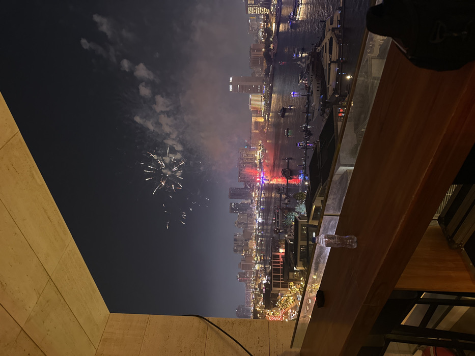 Fireworks explode in the night sky over a cityscape reflected in a waterway. Boats populate the river alongside buildings illuminated with festive lights. The view is from a high vantage point, possibly a balcony or rooftop bar, with a wooden railing in the foreground. A partial view of the building's structure is visible on the left side.