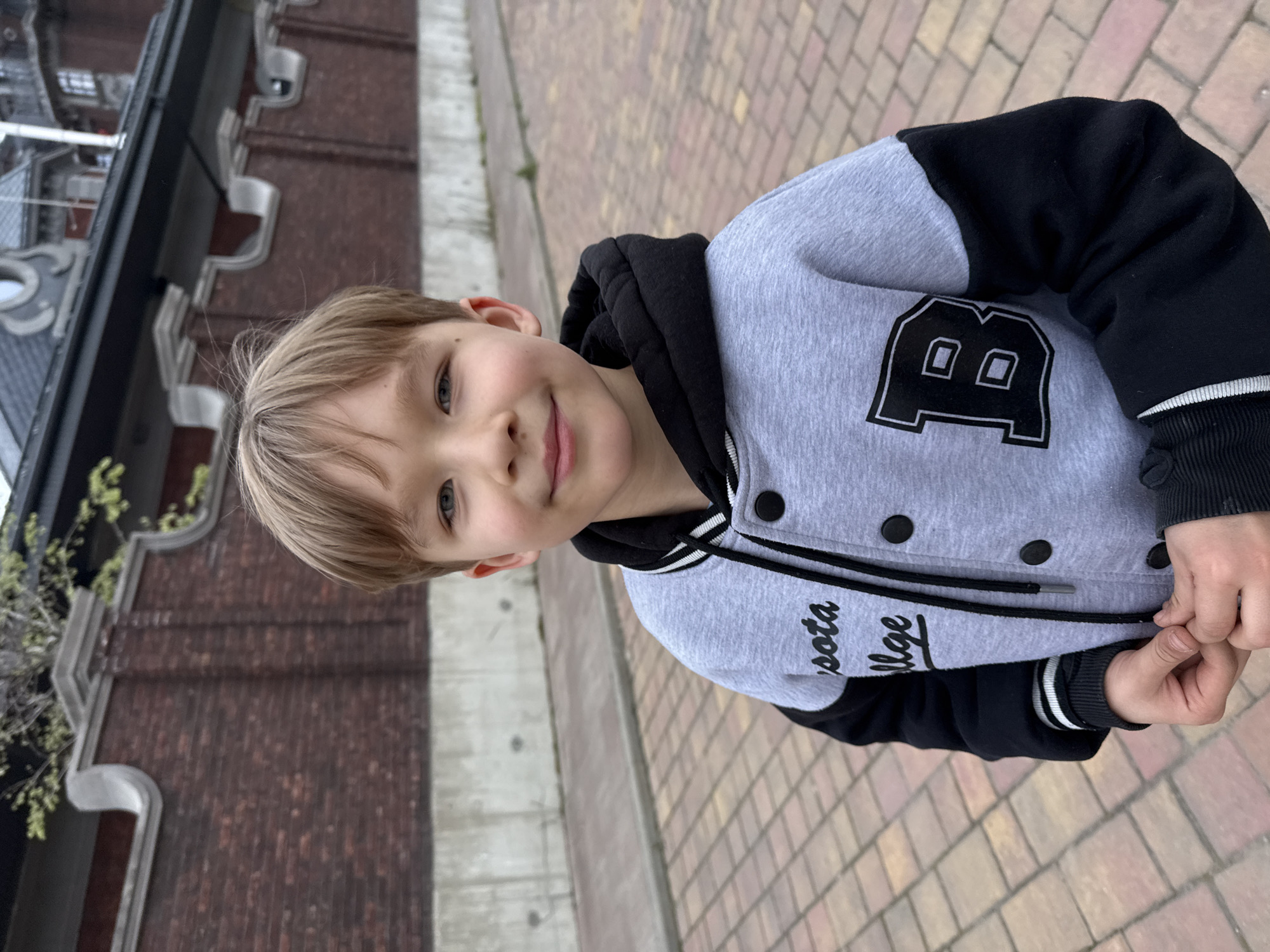 A blond boy smiles at the camera. He stands on a brick sidewalk, in front of a brick building with decorative elements and small branches. He is wearing a light gray jacket with black sleeves, a black hood, and the letter "B" on the chest. The jacket also has "sota" and "llege" written on it. The location could potentially be Rostov-on-Don, Russia.
