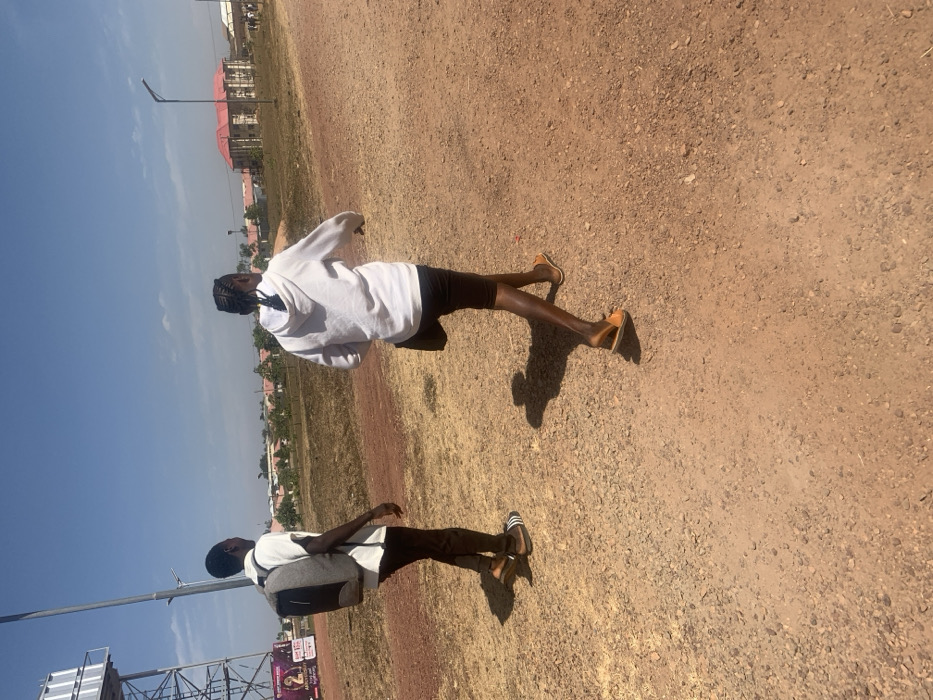 Two people walk across a rough, dirt-covered ground on a sunny day. The first person wears a white hoodie, dark shorts, and brown sandals. Their hair is braided. The second person has a gray backpack, wears a white shirt and pants, and black sneakers with white stripes. Buildings and a metal structure are visible in the background. The sky is clear and blue.