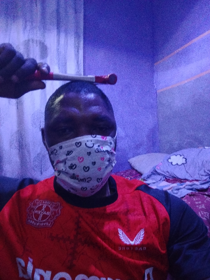 A person wearing a mask with heart and smiley face patterns and a red soccer jersey poses for a picture. An arm extends from the left holding a makeup brush over their head. The background is a room with blue-toned lighting, featuring a bed with patterned sheets and pillows. The image exhibits a grainy texture due to the lighting conditions.
