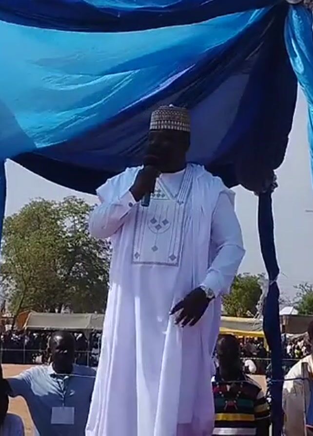 A man wearing a traditional white outfit and a patterned cap speaks into a microphone while standing on a small stage. The stage is adorned with blue fabric. Two large speakers are placed on either side of the stage. A crowd of people stands in front of the stage, some of whom are recording the event with their phones. The sky is visible in the background, and there are some trees and buildings in the distance.