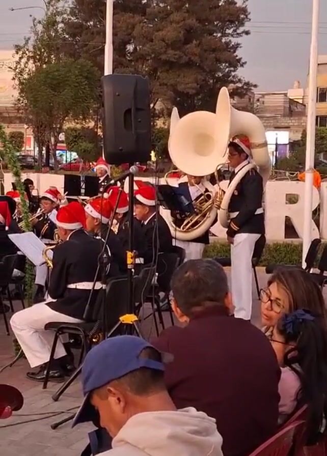 An outdoor scene shows a band of about 10 uniformed musicians wearing Santa hats, and playing instruments. They are seated on chairs with music stands in front of them, and a large speaker to their left. A tuba with a large, upward-pointing bell is particularly prominent. Several people are seated in chairs in front of the band, facing them and listening. A few people stand in the background. The scene takes place in a town square, with buildings and trees in the background. The sky is overcast. The band is playing, and the audience is listening.