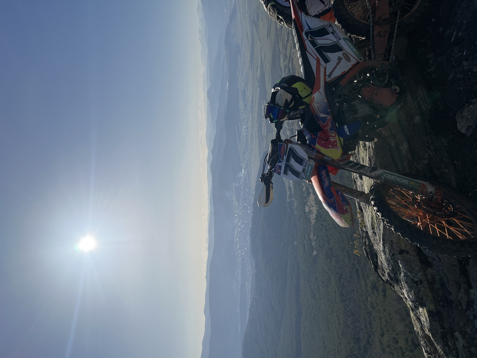 - "An orange and white KTM dirt bike, bearing the racing number 77, is positioned on a rugged, rocky mountain summit overlooking the city of Kostandovo, Bulgaria" by FM-CjNem2, licensed under CC BY 4.0