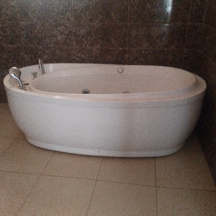 The scene is a static bathroom interior located in Gwarinpa, Nigeria. A large, white, oval-shaped jetted bathtub is centrally positioned on light beige square floor tiles. The tub features chrome fixtures, including a faucet and a handheld showerhead, mounted on its left rim. Multiple circular jets are visible along the interior walls of the bathtub. The wall behind the tub is clad with dark brown rectangular tiles, exhibiting a subtle marbled or textured pattern. No individuals, actions, or interactions are depicted.