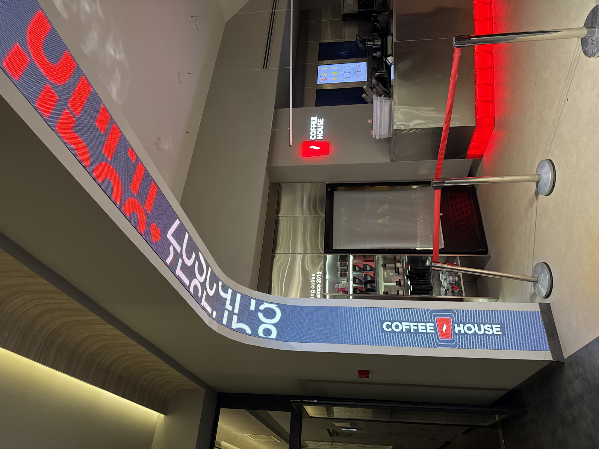 The image depicts a Coffee House establishment, identified by a blue and white LED sign with the logo and name. The sign extends into a curving LED banner displaying red text on a blue background. Interior elements include a menu board above the service area, beverage preparation equipment, and metal shelving. A red velvet rope barrier is visible. The environment suggests an indoor commercial space, located in Yerevan, Armenia based on the signage on the wall. The image is taken at a perspective, likely by someone standing below and looking up at an angle.