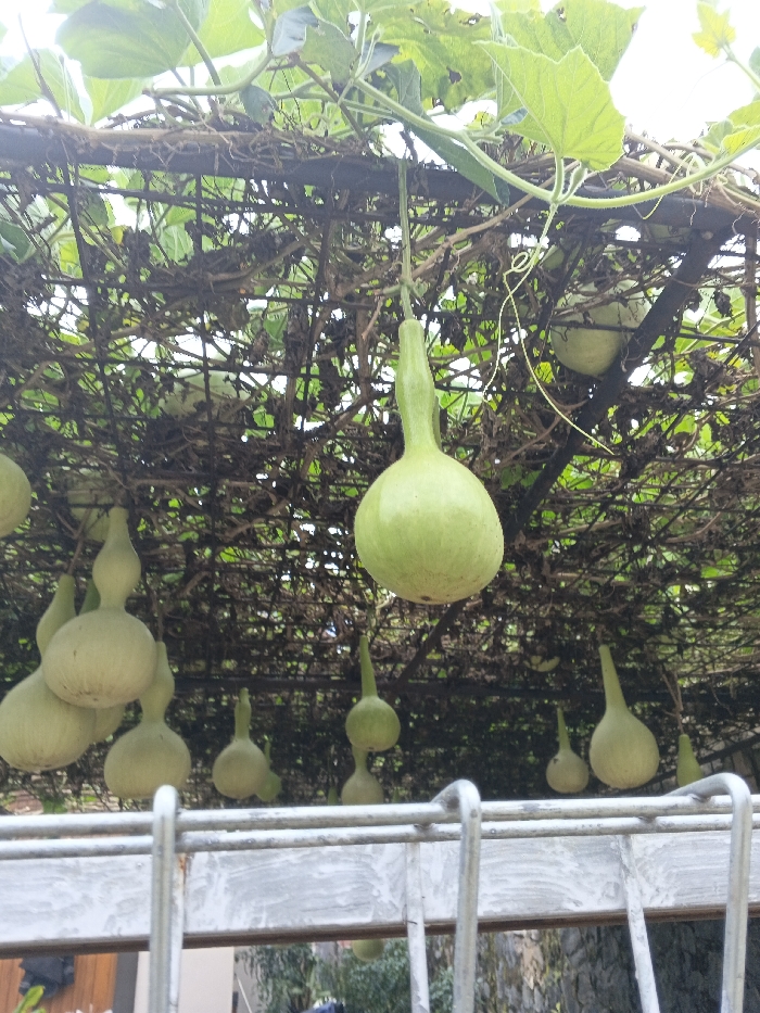- "A vine with large, green gourds hangs from a wooden trellis covered in dense foliage" by FM-lI7Km1, licensed under CC BY 4.0