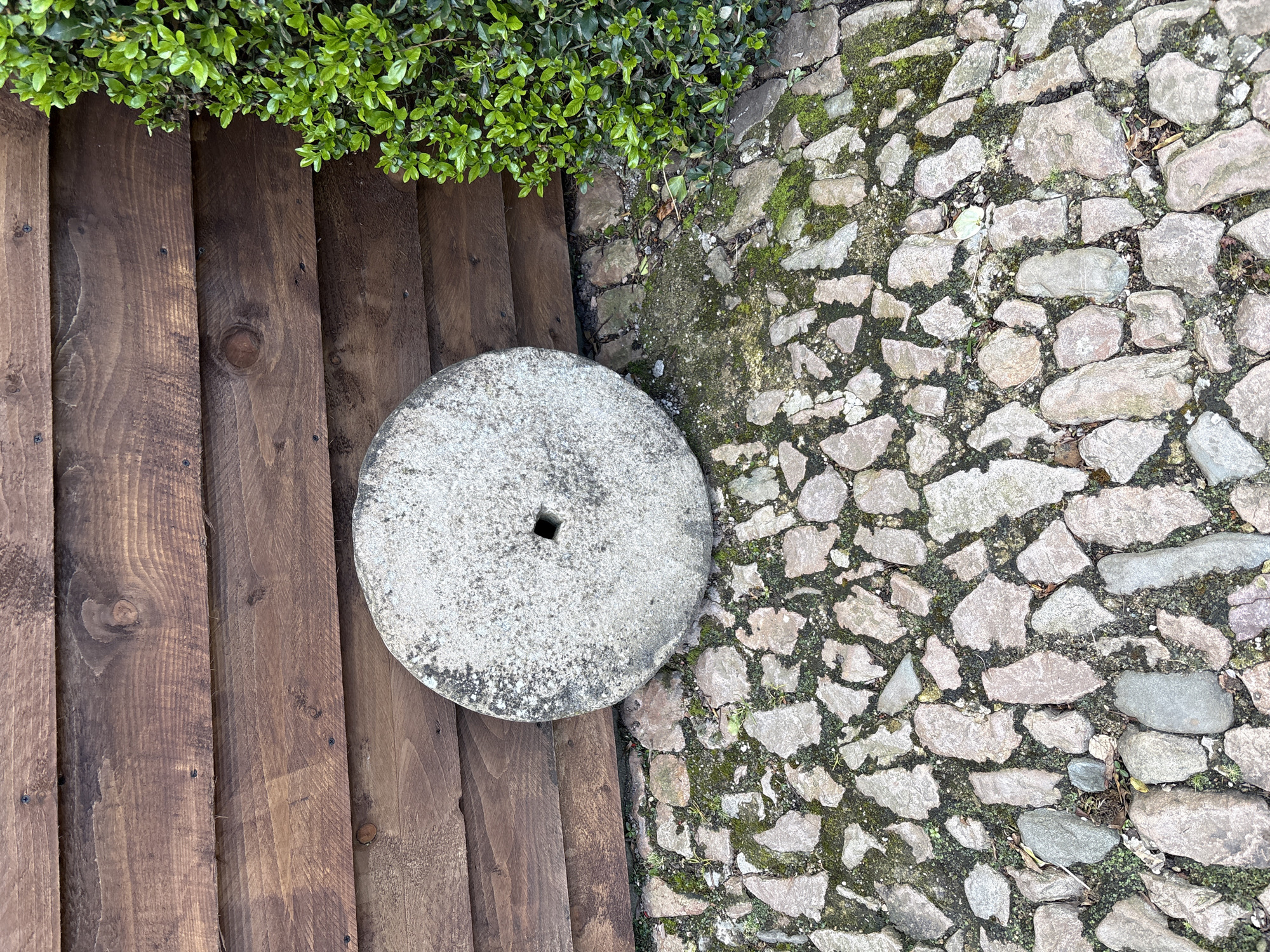 The scene is a ground-level view in Shrewsbury, United Kingdom, showcasing a juxtaposition of materials and textures. To the left is a dark, wooden surface, likely a deck or walkway, consisting of vertical planks with visible wood grain and screws. Above the wood, a neatly trimmed hedge of small, green leaves is present. Next to the wooden surface is a circular, weathered stone object with a square hole in the center. It appears to be resting partially on the wood and partially on the adjacent surface. To the right of the stone is a paved area composed of irregularly shaped stones of varying sizes and colors. The stones are set closely together, and there are traces of moss and dirt between them, indicating a natural or rustic outdoor setting. No people, animals, or interactions are visible. The focus is on the arrangement of different materials and the textures they present.
