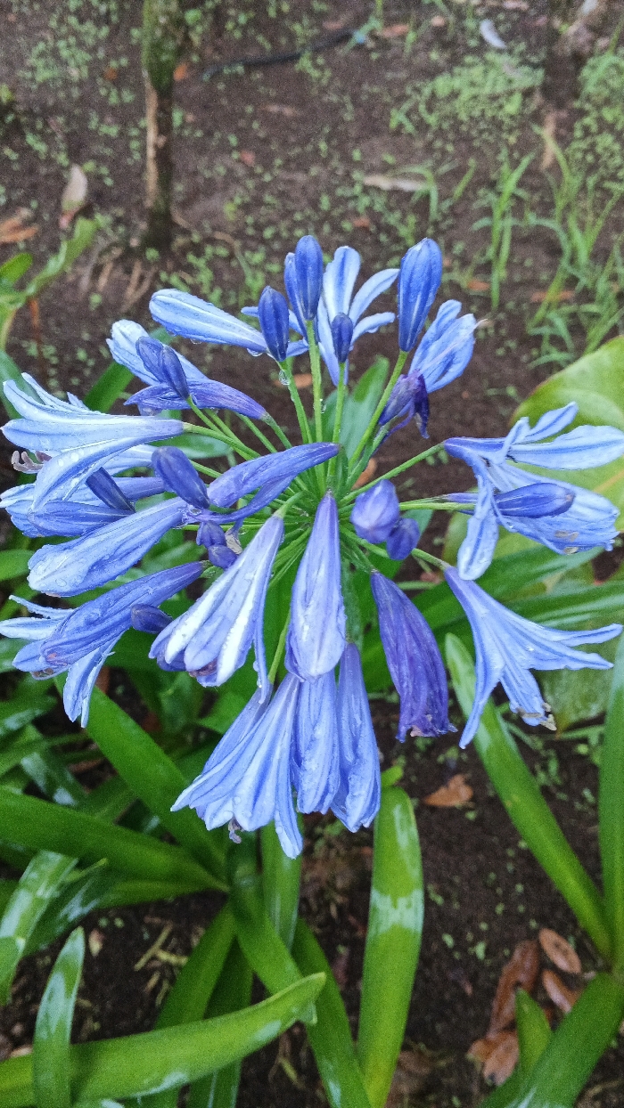 A close-up photograph depicts an inflorescence of Agapanthus (Lily of the Nile) flowers located in Stueng Saen, Cambodia. The central subject is a spherical cluster of numerous blue, bell-shaped flowers and buds, some fully open, others partially, and several still tightly closed. The petals exhibit shades ranging from light blue to a deeper violet-blue, with visible water droplets on their surfaces, indicating recent moisture. The flowers emerge from a base of vibrant green, strap-like leaves, also bearing water droplets. The background consists of dark brown soil, sparsely covered with small green plant growth and indistinct organic debris. A thin, vertical brown element, possibly a small tree trunk or stake, is discernible in the upper background. No people or animals are present.