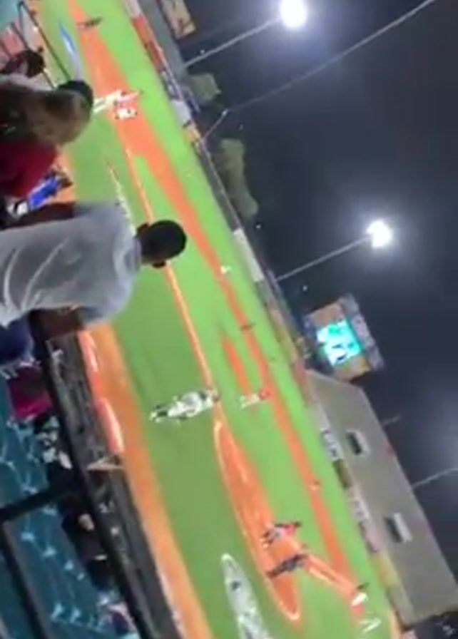 From a high vantage point in an outdoor baseball stadium, a game is in progress. The green field is lined with white markers, with multiple players scattered across it in black and white or orange and black uniforms. Several people sit in the lower left-hand corner of the frame in blue stadium seats. One person is standing, wearing a white shirt. Above the field, there are stadium lights and signage. On the far right, a jumbotron is displaying information. The video is shaky, and the camera is tilted.