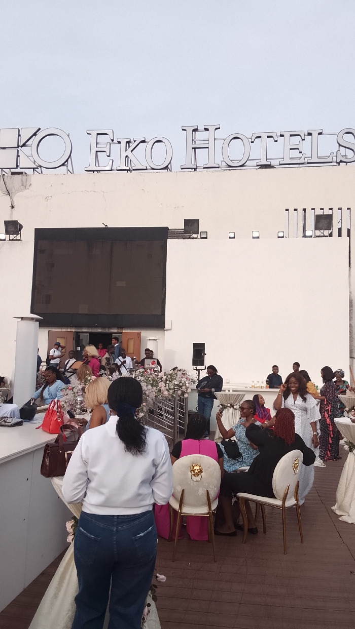 The scene is an outdoor patio of a restaurant, possibly on the rooftop, at the Eko Hotels in Lagos, Nigeria