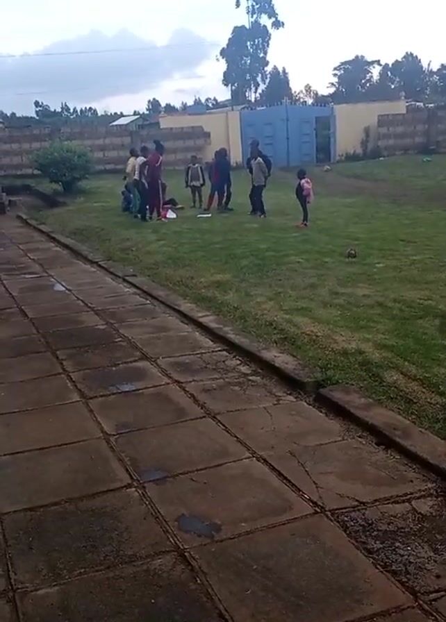 A group of children are gathered on a grassy field next to a paved area with large square tiles. The children appear to be interacting with something spread out on the grass, possibly a blanket or papers. They are dressed in casual clothes. Behind them is a brick wall with a light yellow building and a blue metal gate. Tall trees are visible in the background under a cloudy sky. The camera is stationary, providing a wide shot of the scene.