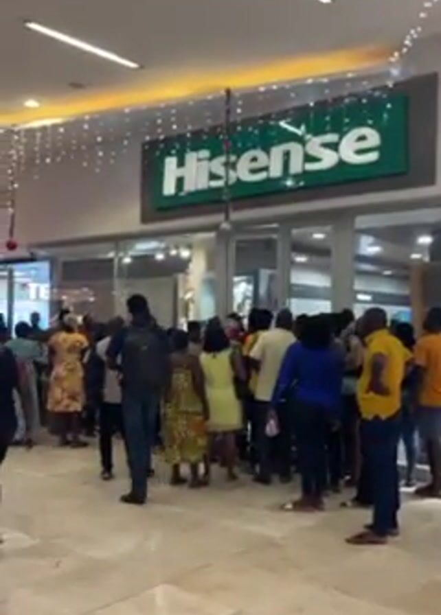 A crowd of people is gathered in a mall in front of a Hisense store. Some individuals are wearing yellow shirts. The video then pans to the left, revealing a MAX.3UY store next to the Hisense store. People are milling around in the area, some wearing casual attire. Decorations are hanging from the ceiling.
