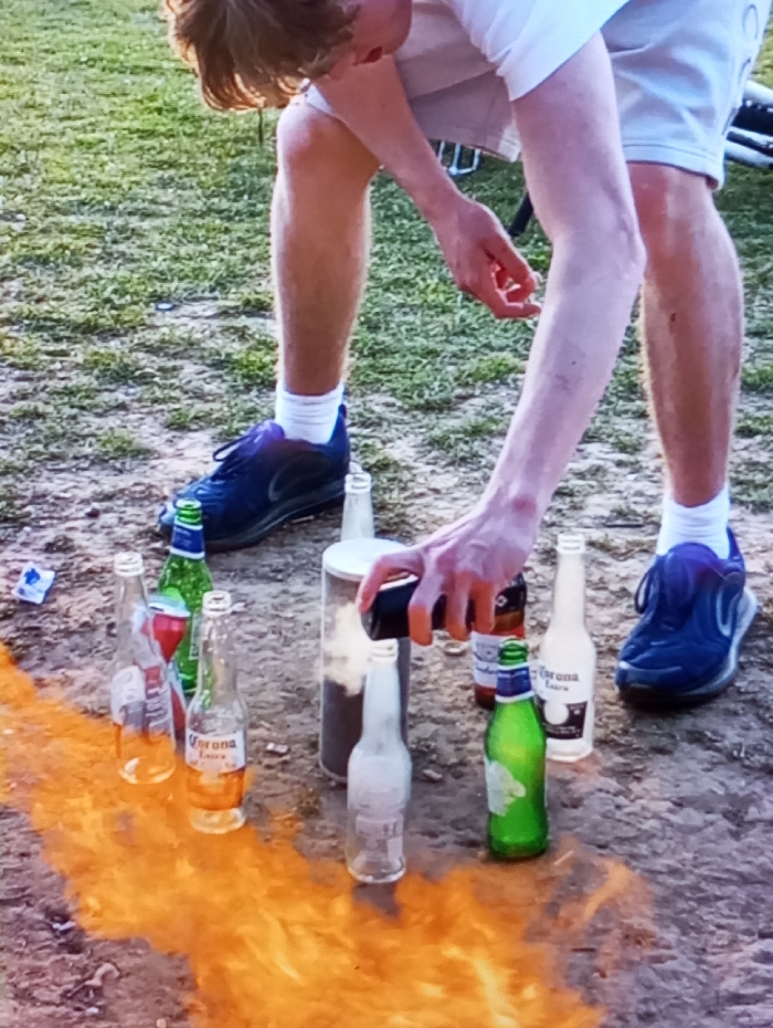 The scene is an outdoor ground area in Miękinia, Poland, composed of packed dirt with interspersed patches of sparse green grass. A male individual, visible from the torso down, is bent forward, facing downwards. He has light brown hair, wears a white t-shirt, light-colored shorts, white socks, and dark blue athletic shoes. His right hand holds a black object, possibly a lighter or a small aerosol can, from which a white plume of vapor or smoke is being directed into the neck of a clear glass bottle. On the dirt ground, a line of orange flames burns continuously, horizontally across the frame, passing beneath several objects. Arranged on either side of or within close proximity to this flame line are multiple glass bottles, including at least two clear Corona Extra branded bottles and one green bottle. One clear bottle, directly under the individual's hand, is actively receiving the plume. A silver cylindrical container with a white lid, consistent with a snack food can, stands upright near the bottles, with a visible emission of white smoke or vapor near its top. A small piece of red and white refuse is present on the far left of the scene.