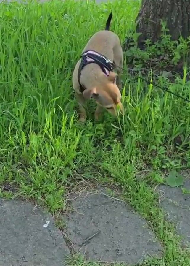 A small, tan dog with a black tail sniffs the ground in a patch of green grass. The dog wears a black and pink harness and is attached to a leash. The dog is standing next to a tree trunk and a stone pathway. A car is parked on the street in the background.
